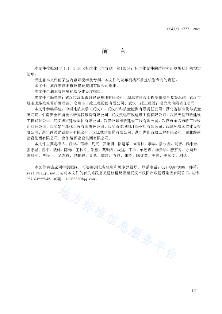 武汉市汉阳市政建设集团有限公司、湖北省建设工程质量安全监督总站、武汉市城市道路维修养护管理站、沧州市市政工程股份有限公司、武汉市政工程设计研究院有限责任公司、中国地质大学(武汉)、武汉汇科质量检测有限责任公司、湖北省标准化与质量研究院、中南安全环境技术研究院股份有限公司、武汉致远市政建设工程有限公司、武汉天创市政建设工程有限公司、武汉博宏建设集团有限公司、武汉钟鑫市政建设工程有限公司、武汉市承远市政工程设计有限公司、武汉琴台绿化工程有限责任公司、武汉市盛璟阳环保材料有限公司、武汉环城运维建设有限公司、湖北