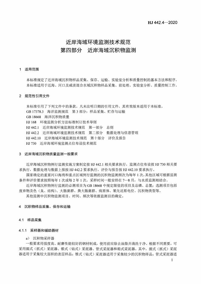 HJ 442.4-2020 近岸海域环境监测技术规范 第四部分 近岸海域沉积物监测
