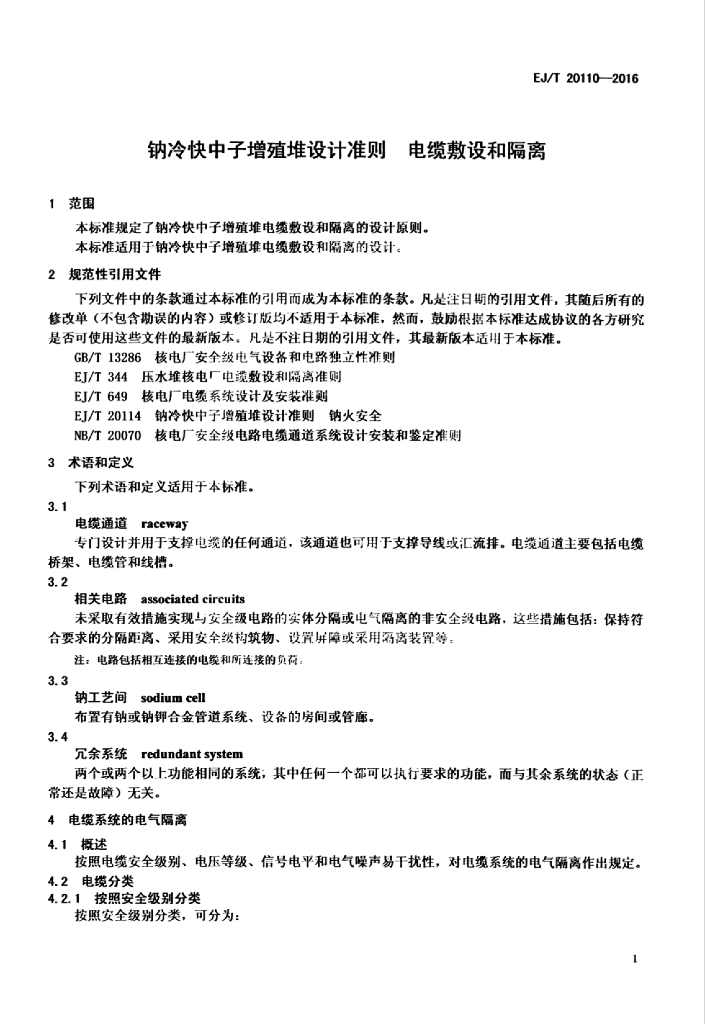 EJ/T 20110-2016 钠冷快中子增殖堆设计准则 电缆敷设和隔离