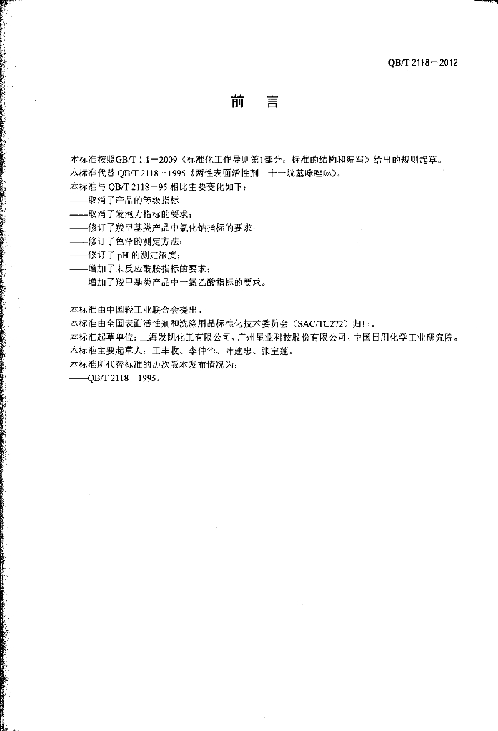QB/T 2118-2012 两性表面活性剂十一 烷基咪唑啉