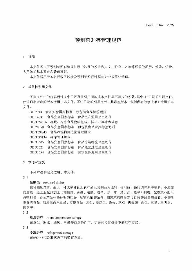 DB62/T 5167-2025 预制菜贮存管理规范