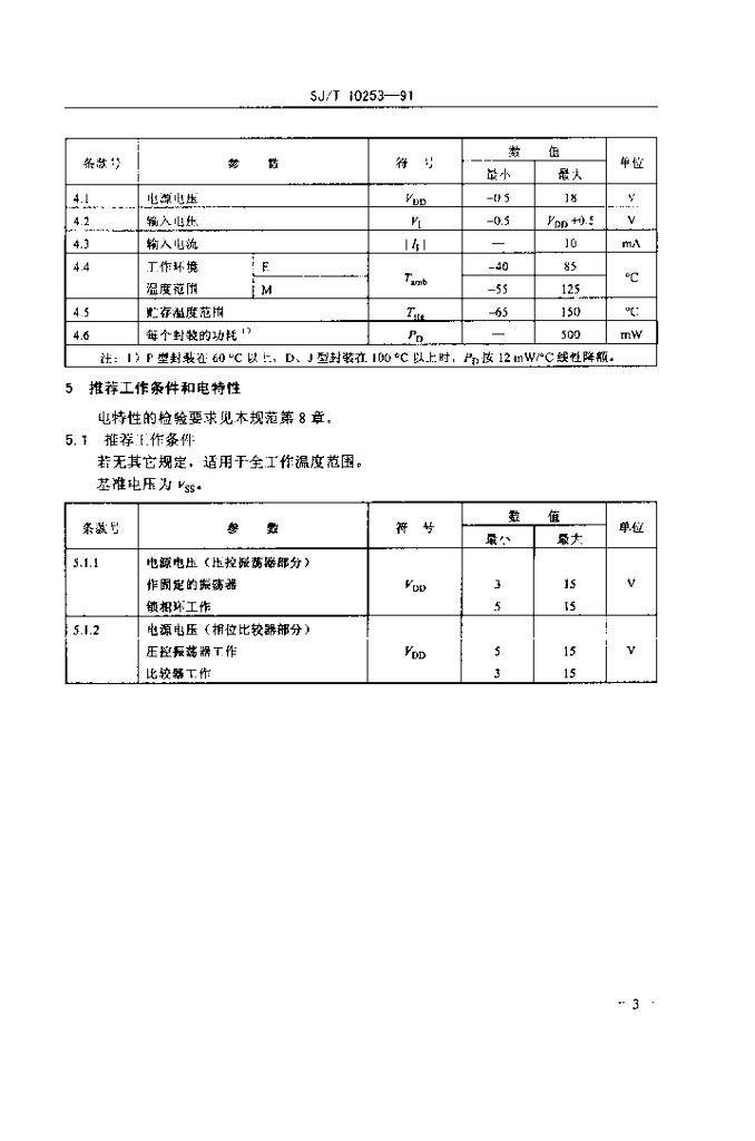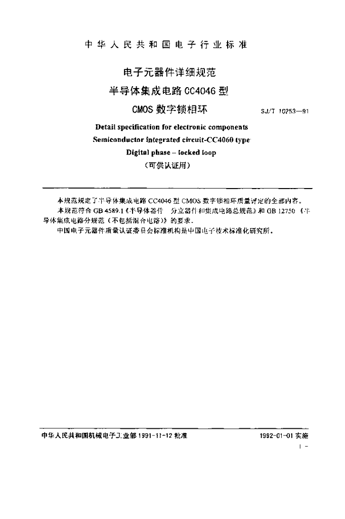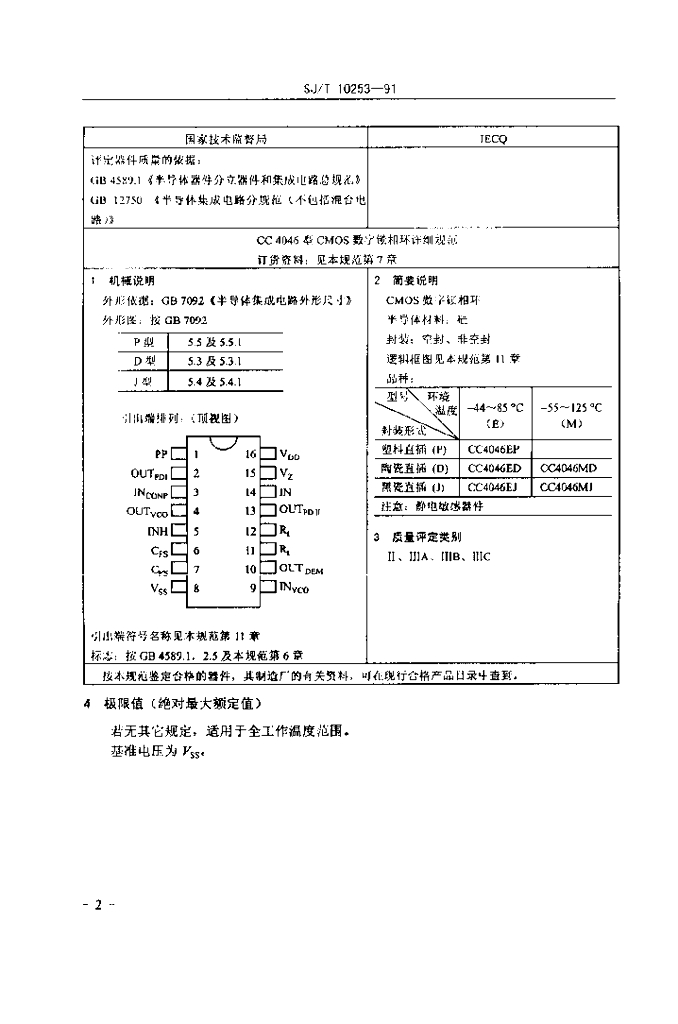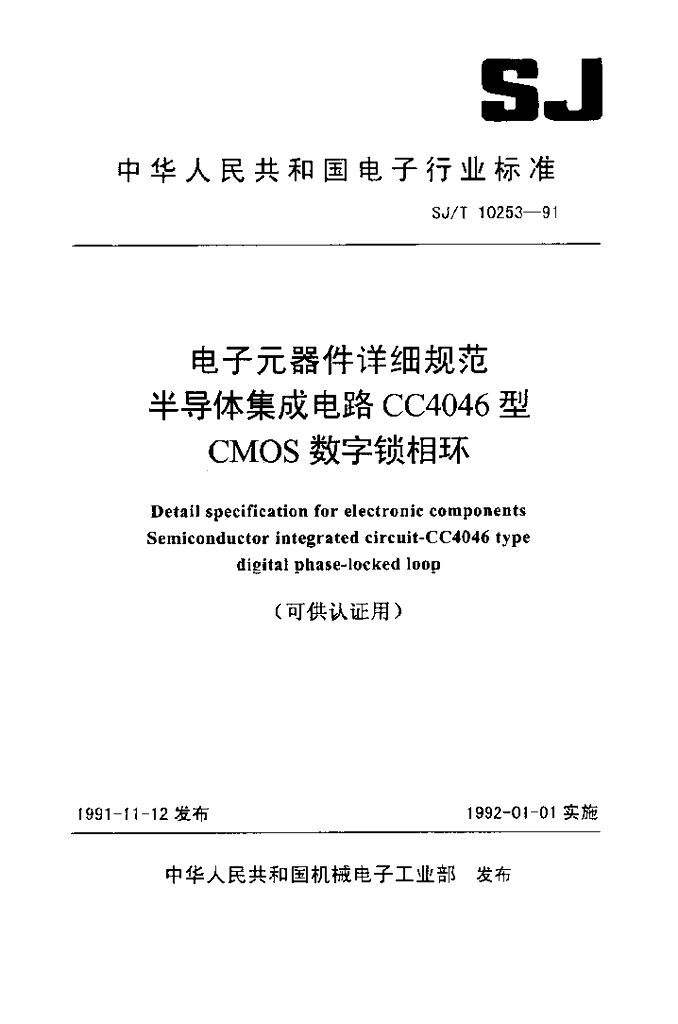 SJ/T 10253-1991 电子元器件详细规范 半导体集成电路CC4046型CMOS数字锁相环详细规范