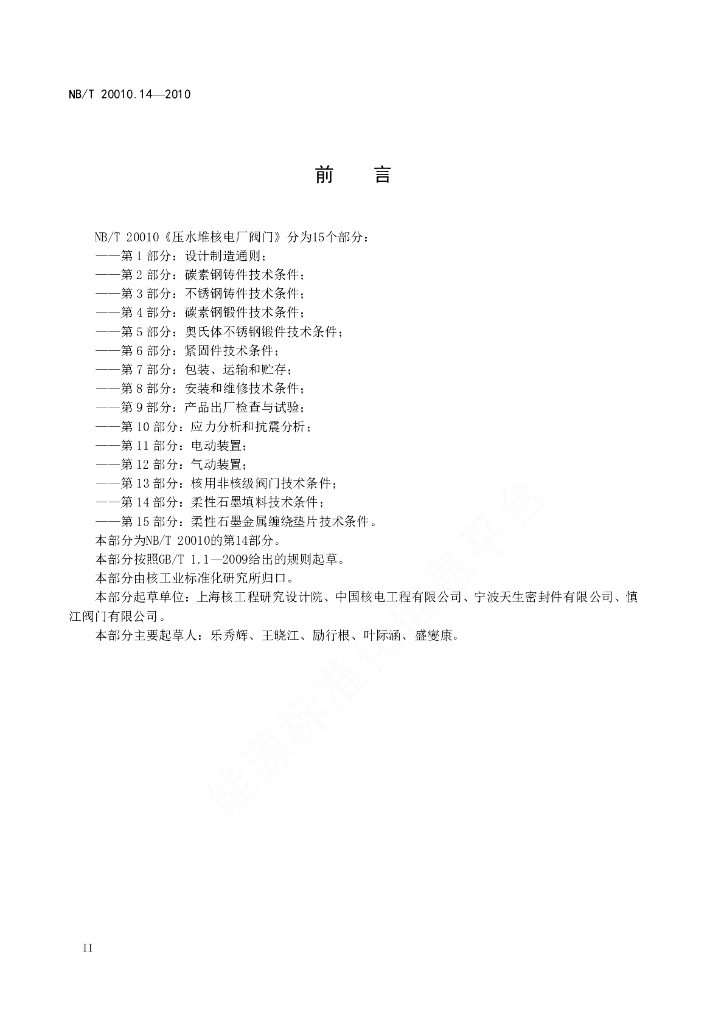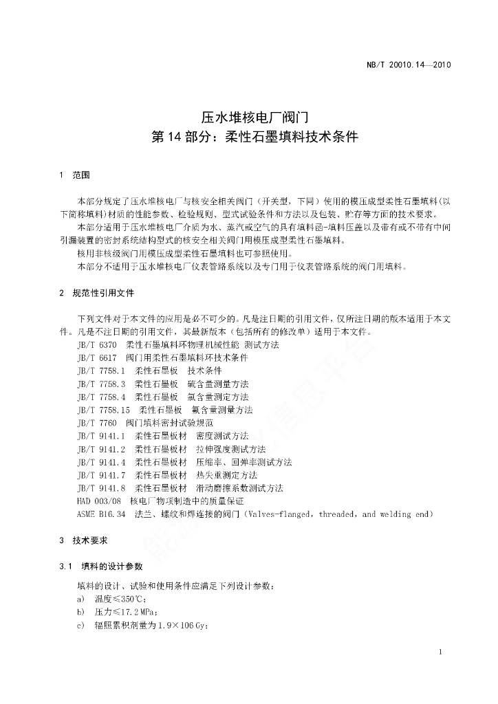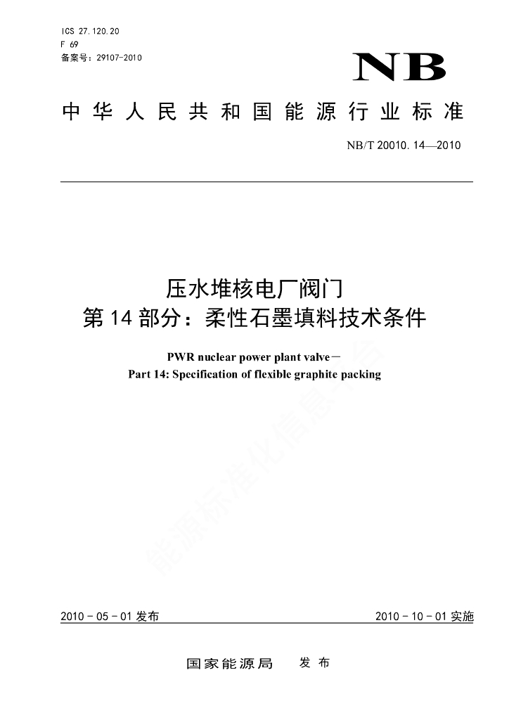 NB/T 20010.14-2010 压水堆核电厂阀门 第14部分:柔性石墨填料技术条件