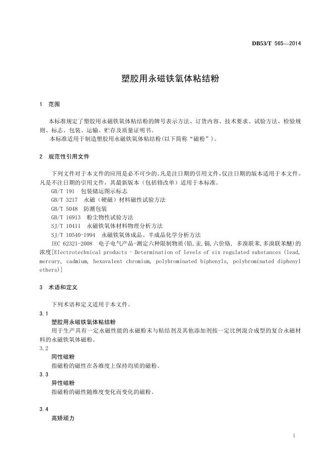 DB53/T 565-2014 塑胶用永磁铁氧体粘结粉