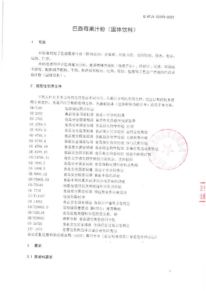 Q/AFJX 0059S-2022 巴西莓果汁粉(固体饮料)