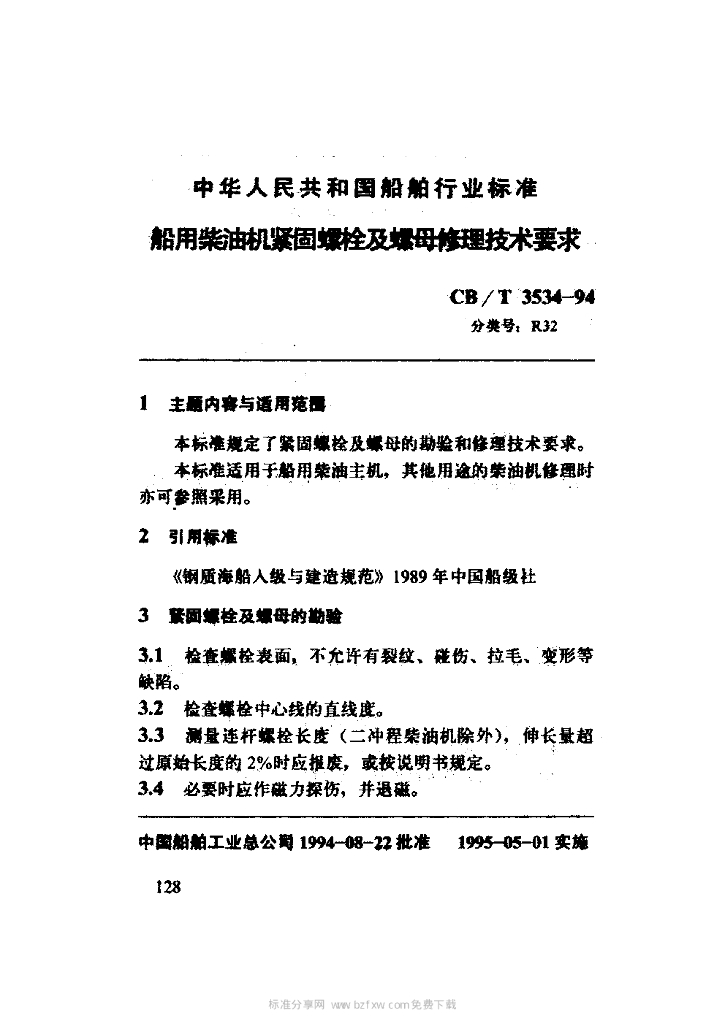 CB/T 3534-1994 船用柴油机紧固蜴栓及蜴母修理技术要求