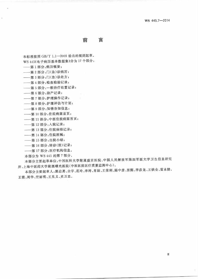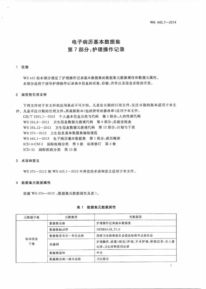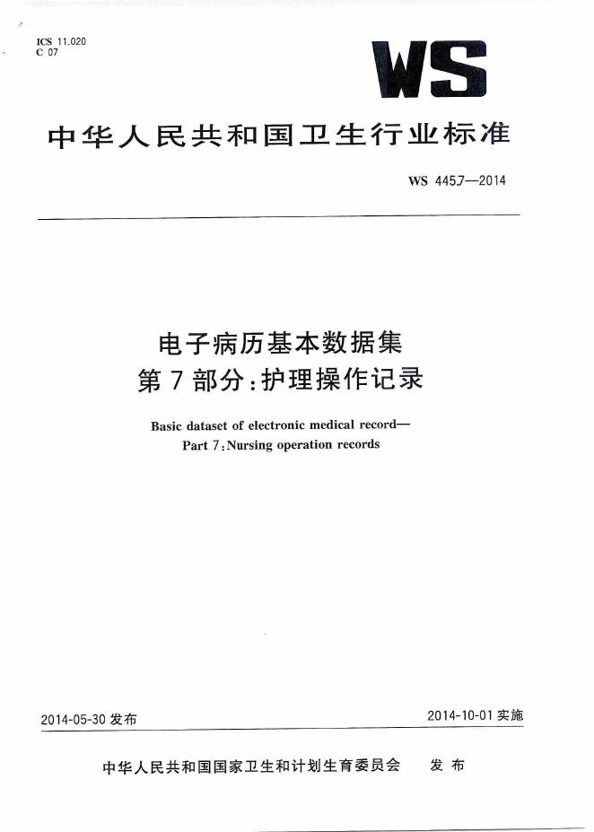 WS 445.7-2014 电子病历基本数据集 第7部分:护理操作记录
