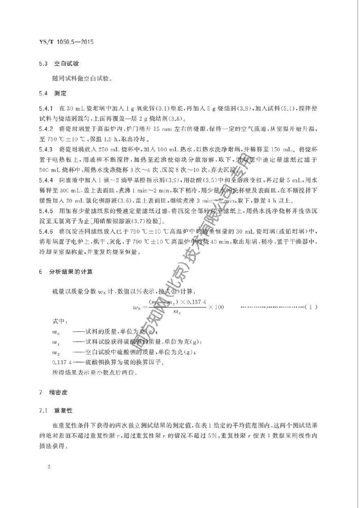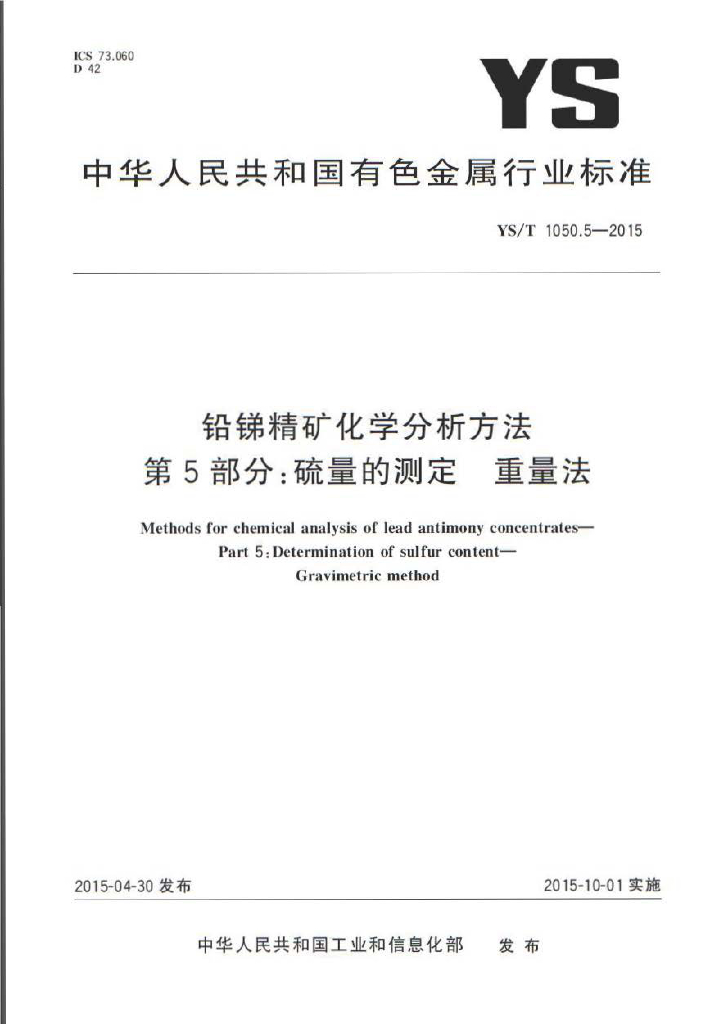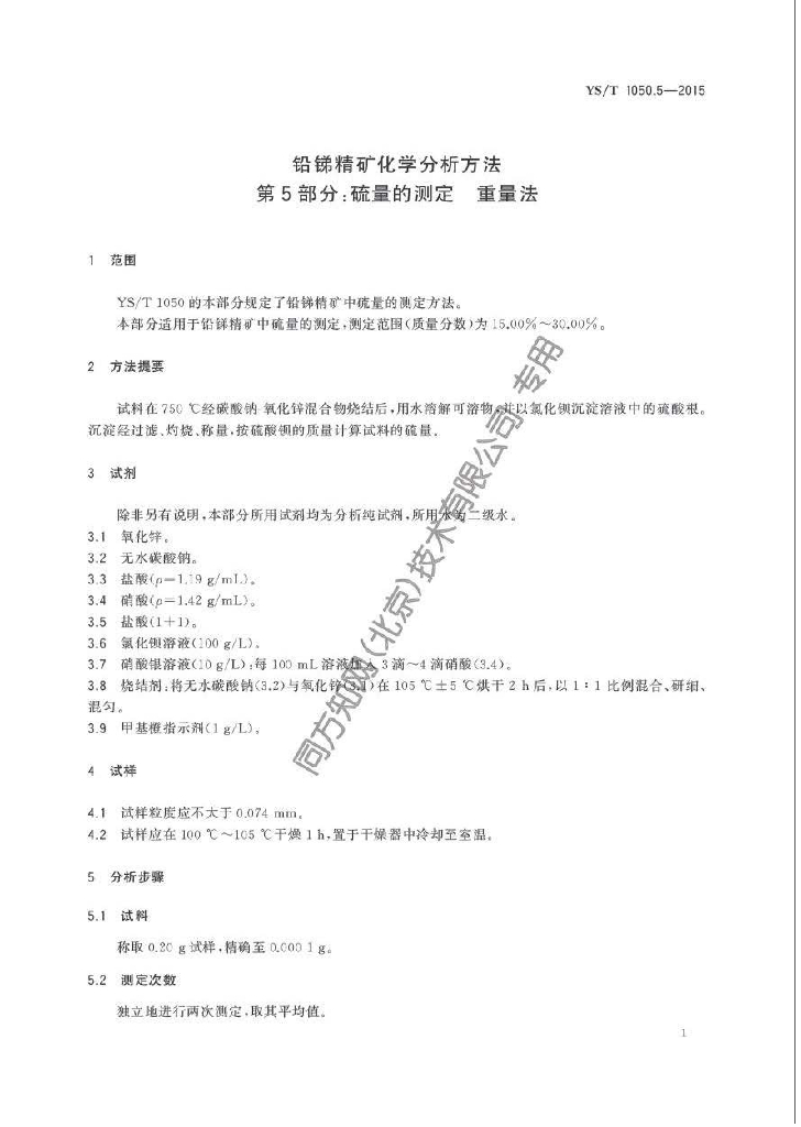 YS/T 1050.5-2015 铅锑精矿化学分析方法 第5部分:硫量的测定 重量法