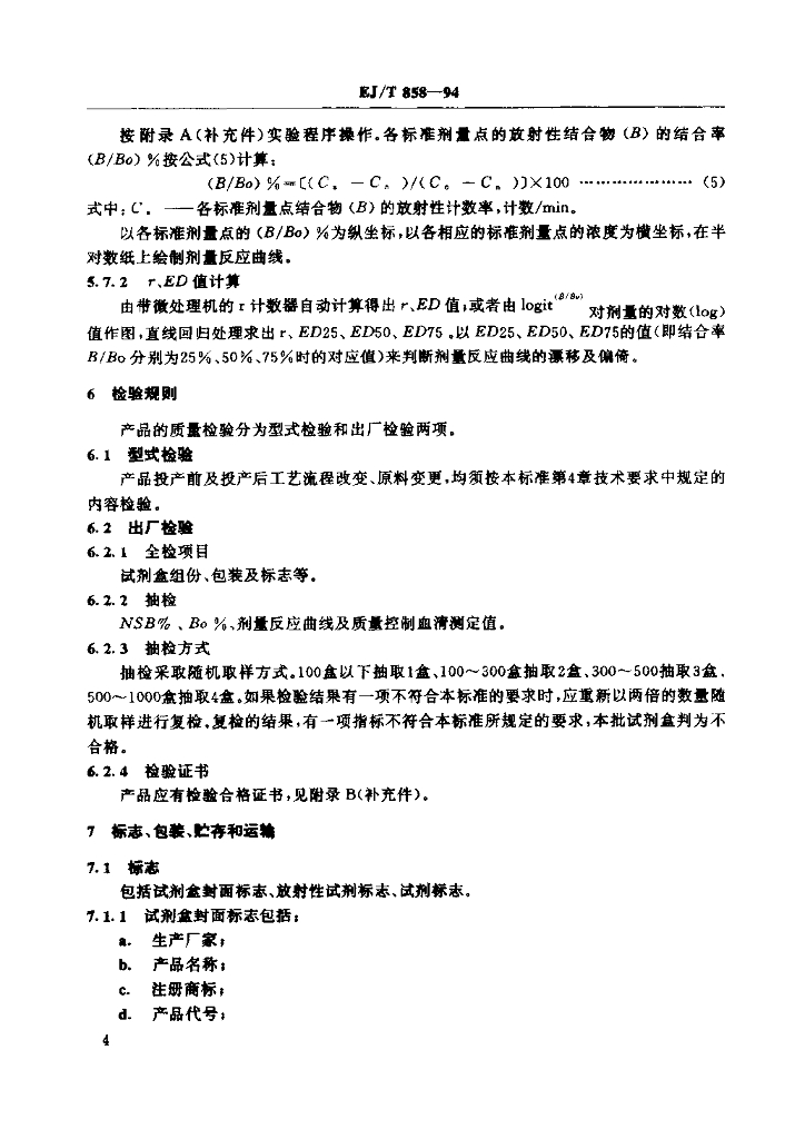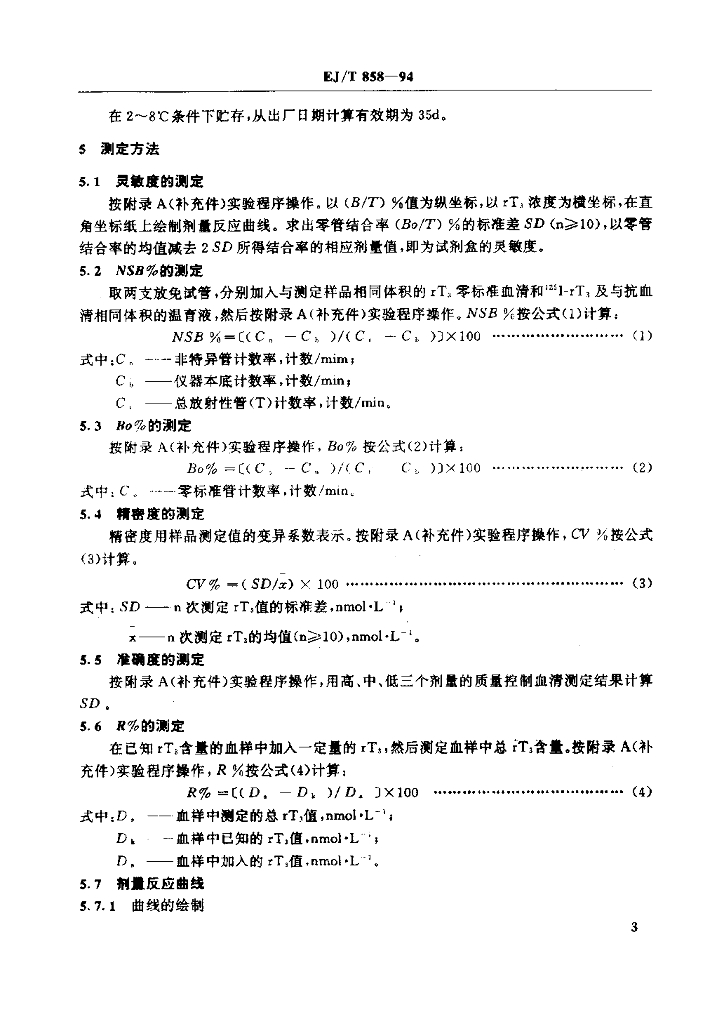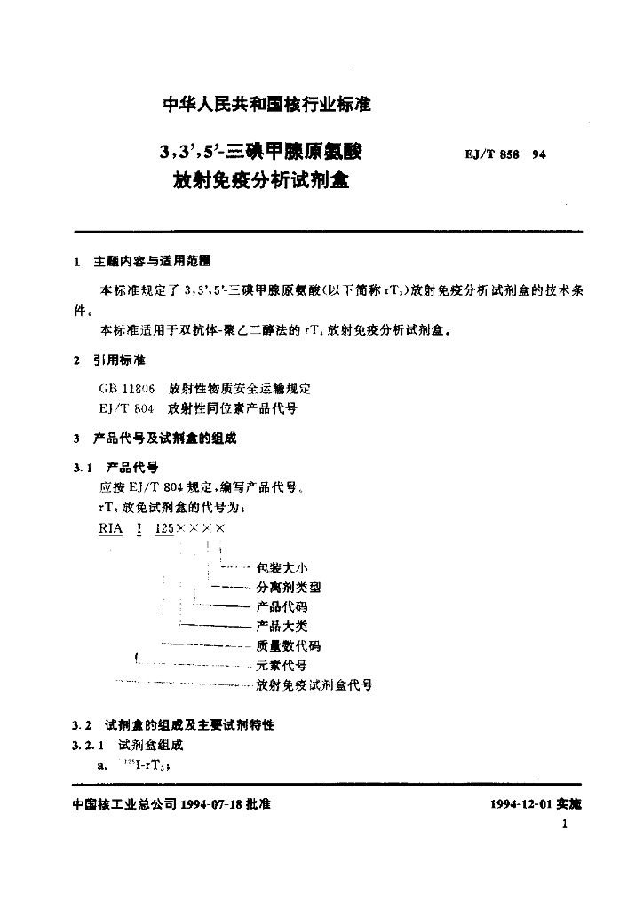 EJ/T 858-1994 三碘甲腺原氨酸放射免疫分析试剂盒