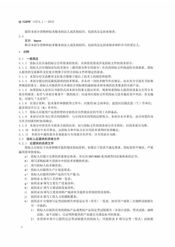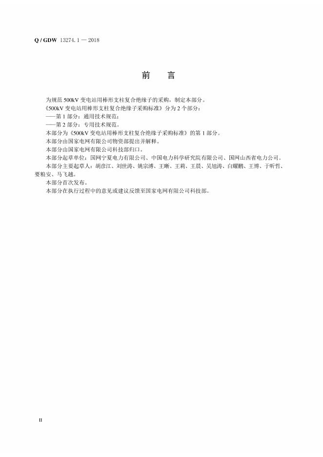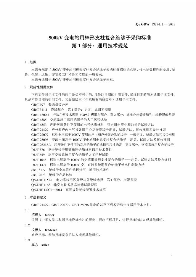 Q/GDW 13274.1-2018 500kV变电站用棒形支柱复合绝缘子采购标准 第1部分:通用技术规范