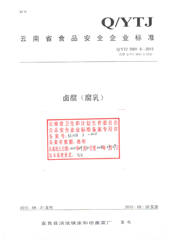 Q/YTJ 0001S-2015 宜良县汤池镇家和坊酱菜厂 卤腐(腐乳)