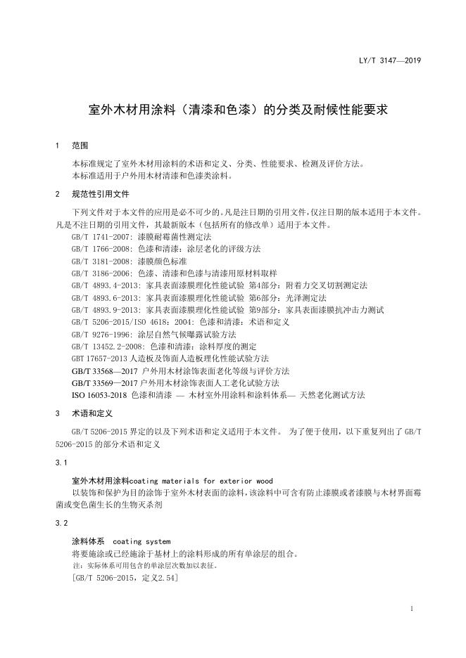 LY/T 3147-2019 室外木材用涂料(清漆和色漆)分类及耐候性能要求