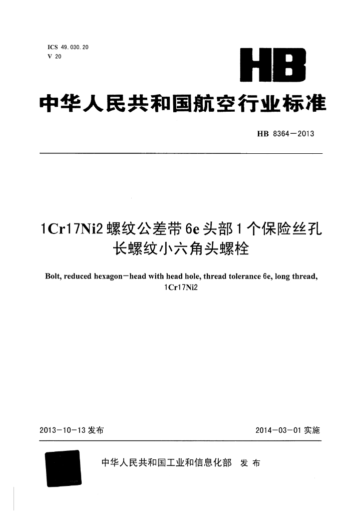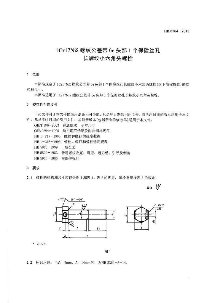 HB 8364-2013 1Cr17Ni2螺纹公差带6e头部1个保险丝孔长螺纹小六角头螺栓