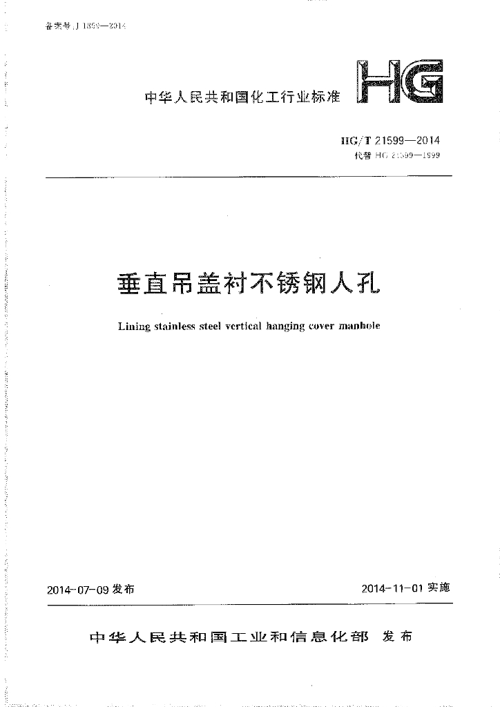 HG/T 21599-2014 代替 HG 21599-1999 垂直吊盖衬不锈钢人孔