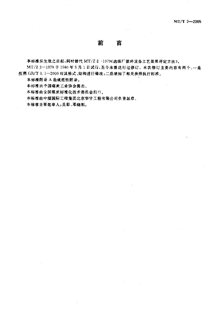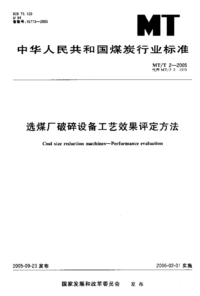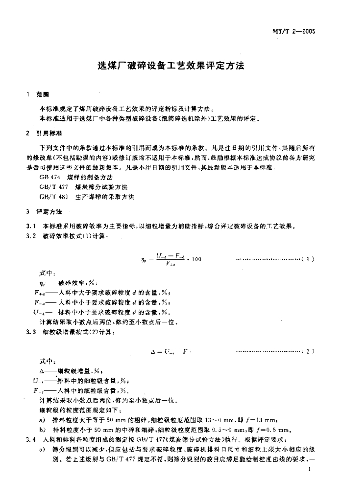MT/T 2-2005 选煤厂破碎设备工艺效果评定方法