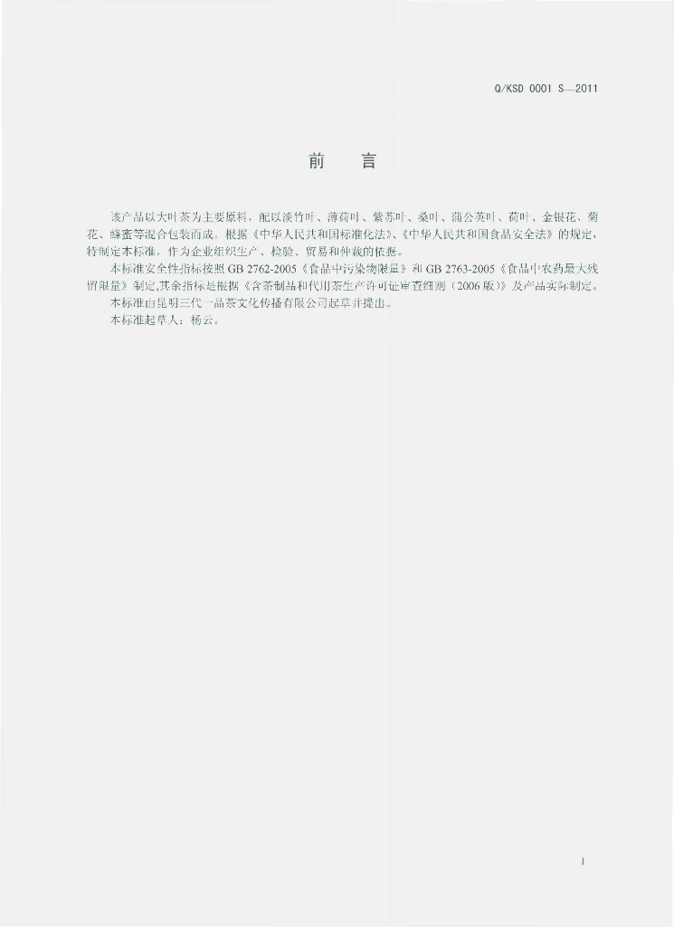 Q/KSD 0001S-2011 含茶制品