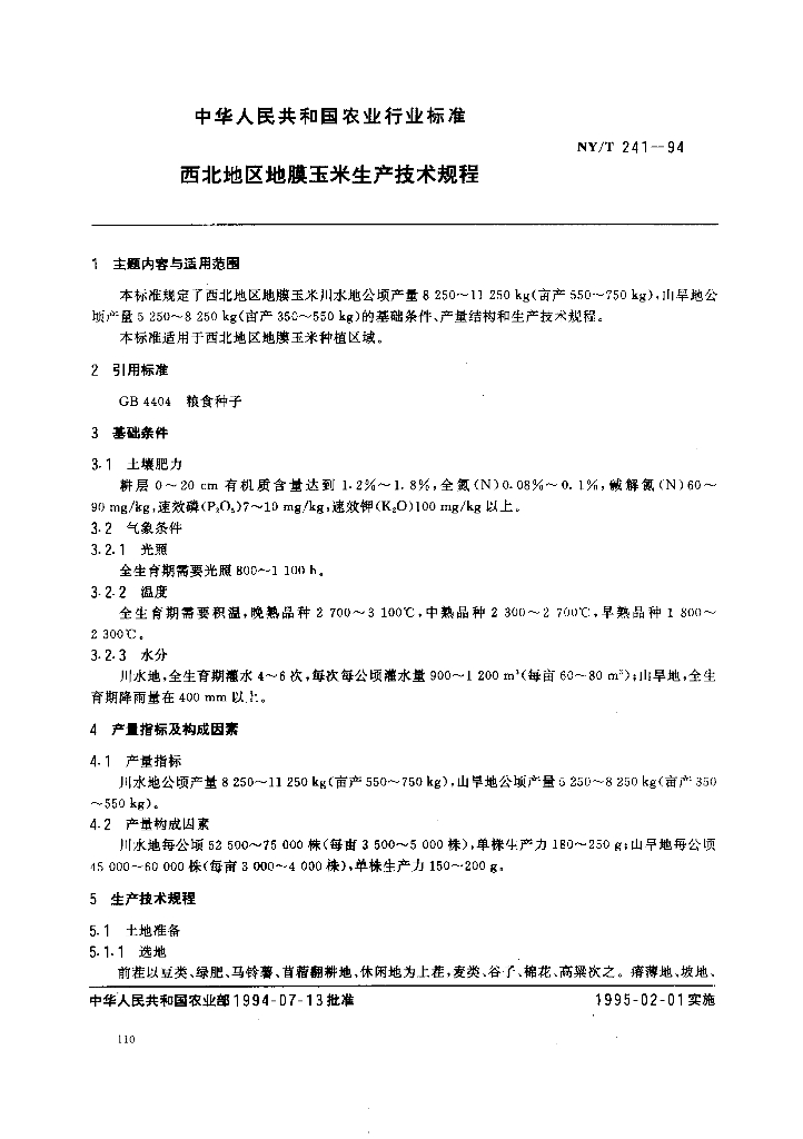 NY/T 241-1994 西北地区地膜玉米生产技术规程