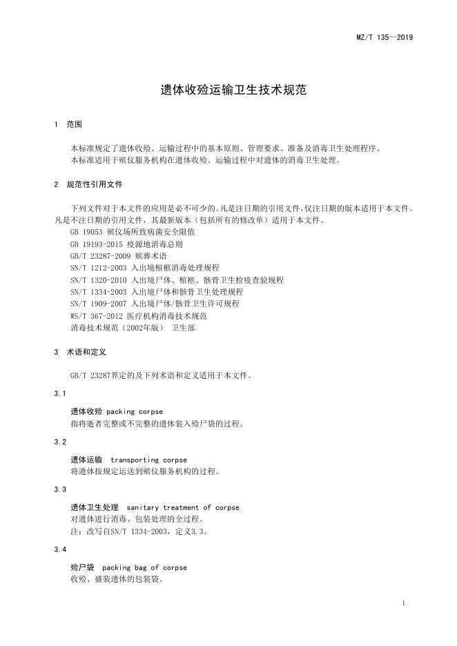 MZ/T 135-2019 遗体收殓运输卫生技术规范
