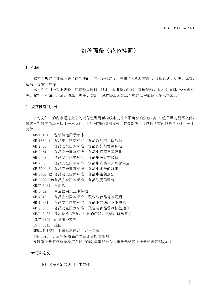 Q/LCT 0003S-2021 红稗面条(花色挂面)