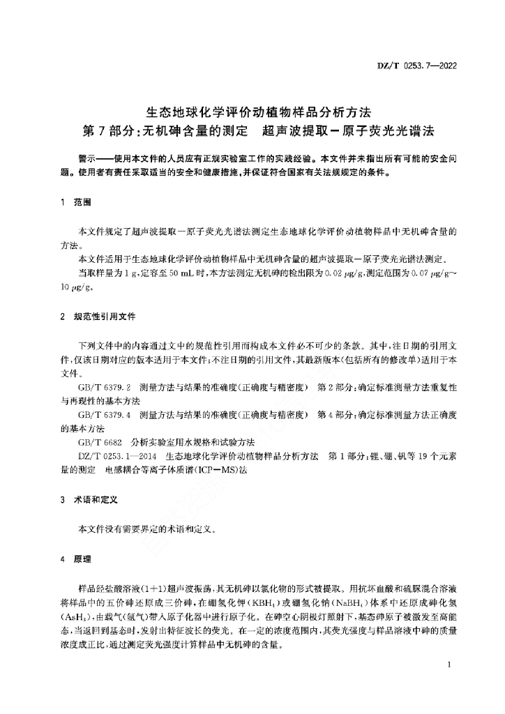 DZ/T 0253.7-2022 生态地球化学评价动植物样品分析方法 第7部分:无机砷含量的测定 超声波提取-原子荧光光谱法
