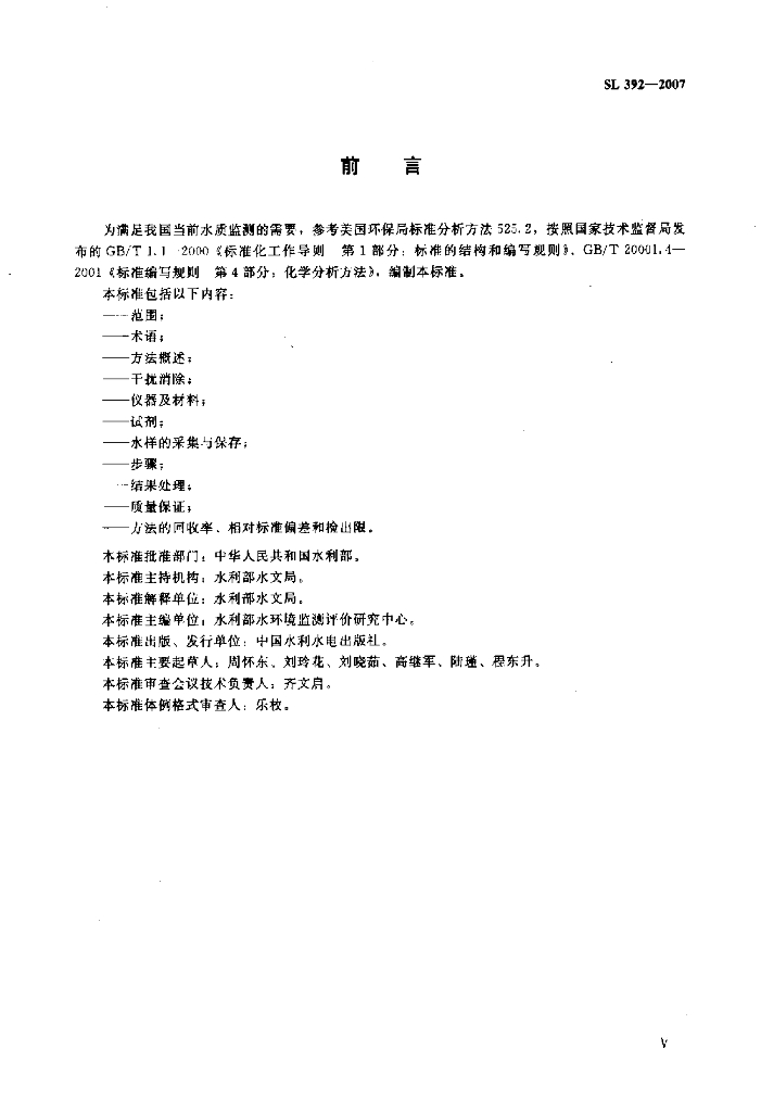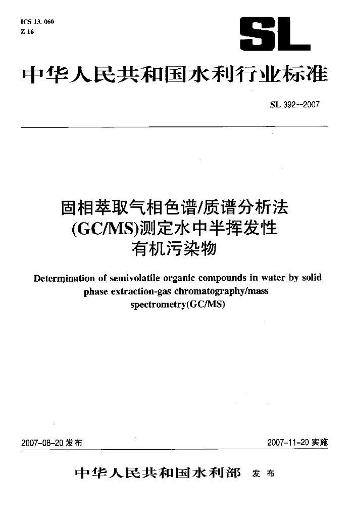 SL 392-2007 固相萃取气相色谱-质谱分析法(GC-MS)测定水中半挥发性有机污染物
