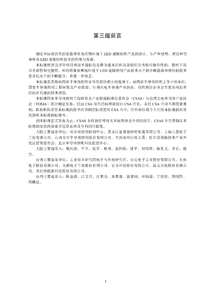 大陆主要起草单位:哈尔滨照明检测中心、黑龙江省爱普照明电器有限公司、上海三思电子工程有限公司、山西光宇半导体照明股份有限公司、大兴安岭行政公署、哈尔滨高新技术产业开发区管理委员会、北京半导体照明科技促进中心。、台湾主要起草单位:工业技术研究院电子与光电研究所、台达电子工业股份有限公司、光林电子股份有限公司、光鼎电子工业股份有限公司、宏齐科技股份有限公司、晶元光电股份有限公司、杰仕特能源科技股份有限公司。