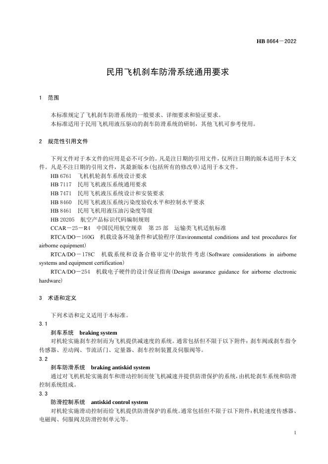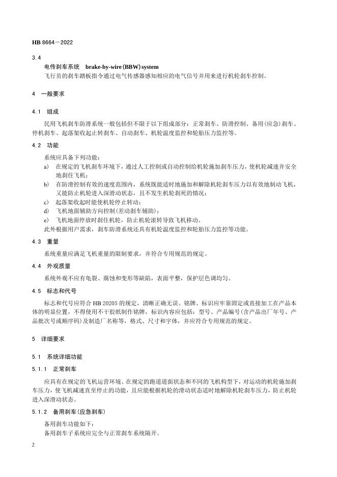 HB 8664-2022 民用飞机刹车防滑系统通用要求