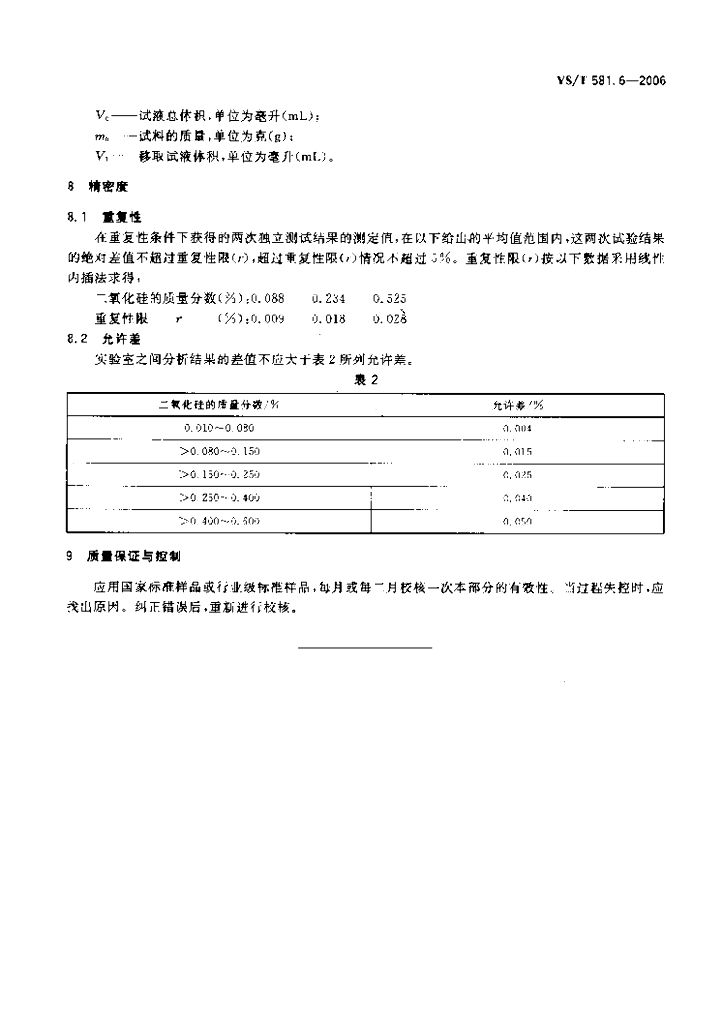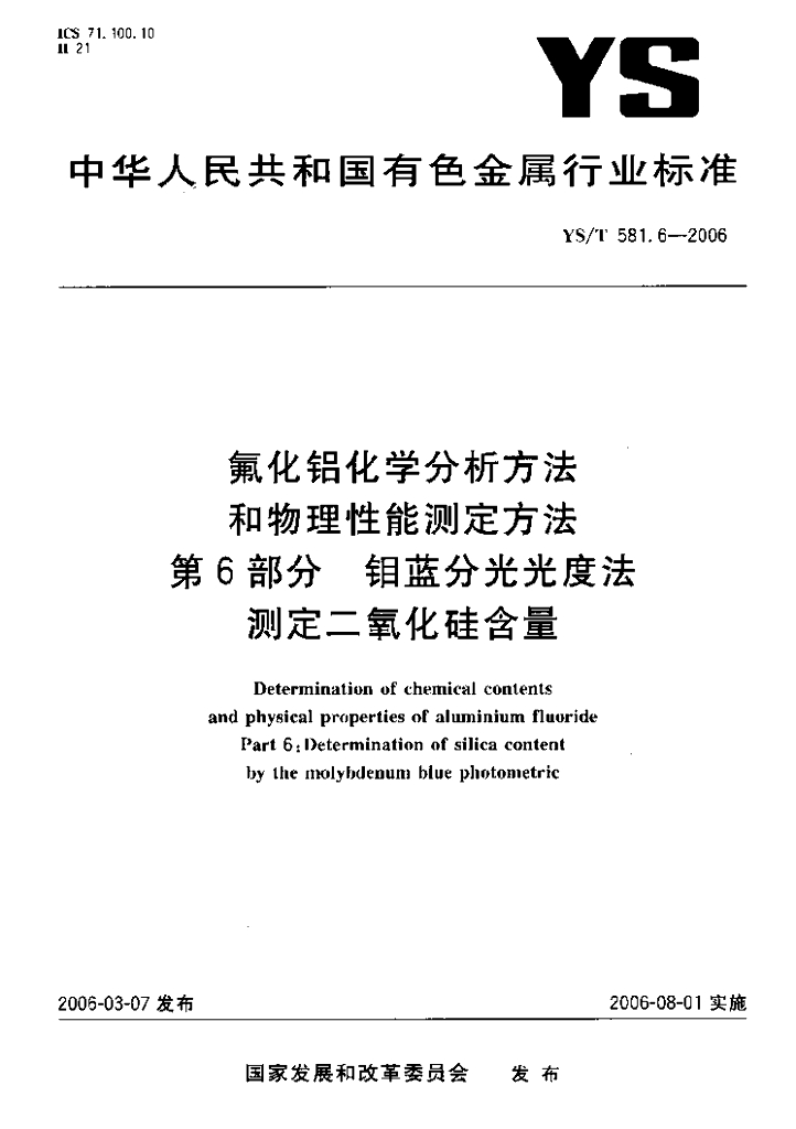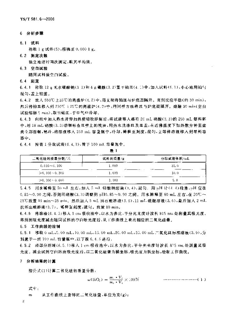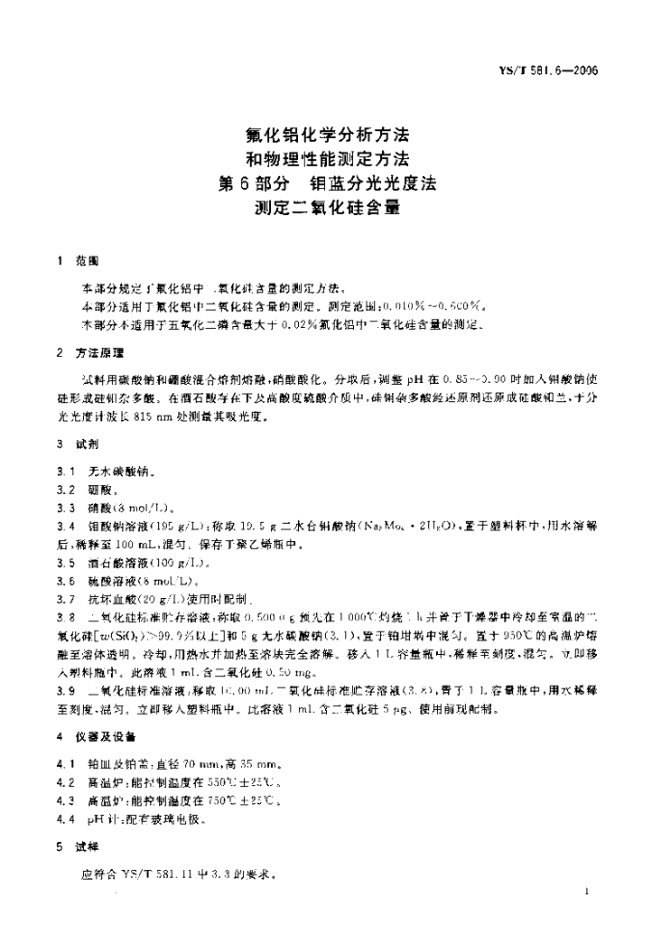 YS/T 581.6-2006 氟化铝化学分析方法和物理性能测定方法 第6部分:钼蓝分光光度法测定二氧化硅含量