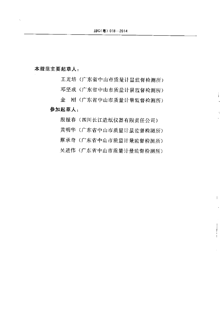 王光培(广东省中山市质量计量监督检测所)、金刚(广东省中山市质量计量监督检测所)、邓坚成(广东省中山市质量计量监督检测所)、殷报春(四川长江造纸仪器有限责任公司)、黄明华(广东省中山市质量计量监督检测所)、蔡承奇(广东省中山市质量计量监督检测所)、吴进伟(广东省中山市质量计量监督检测所)