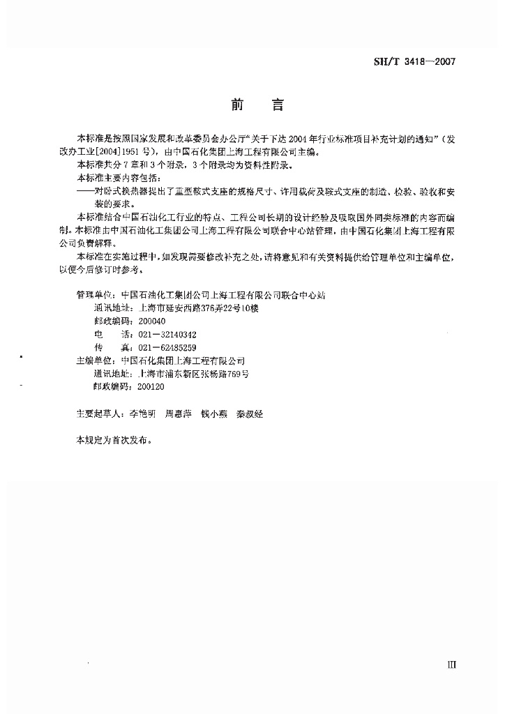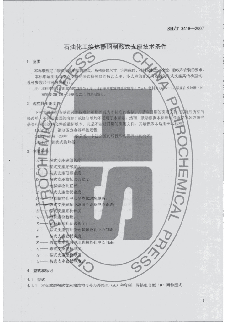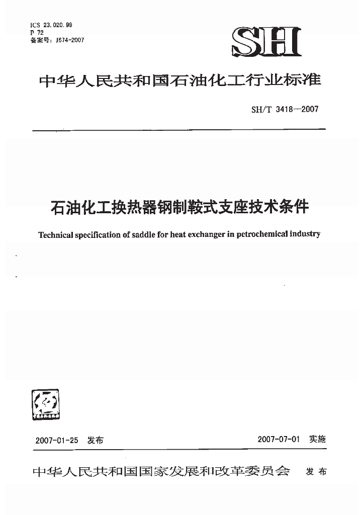 SH/T 3418-2007 石油化工换热器钢制鞍式支座技术条件