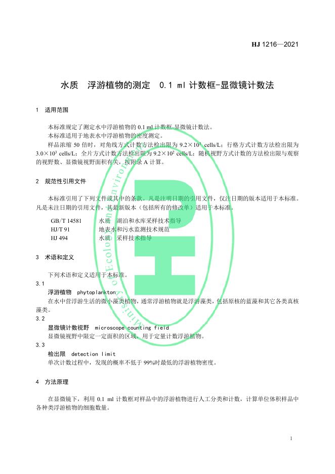 HJ 1216-2021 水质 浮游植物的测定 0.1 ml计数框-显微镜计数法