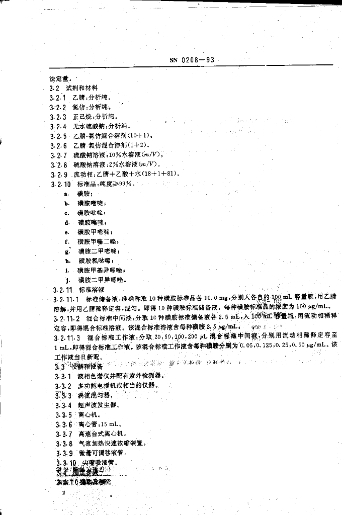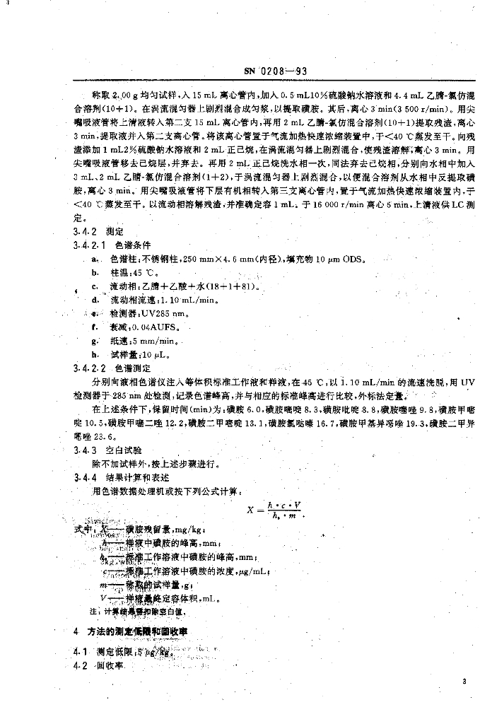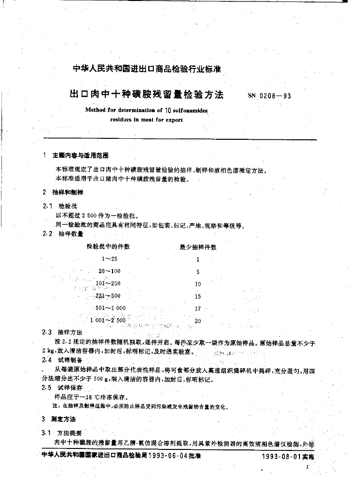SN 0208-1993 出口肉中十种磺胺残留量检验方法