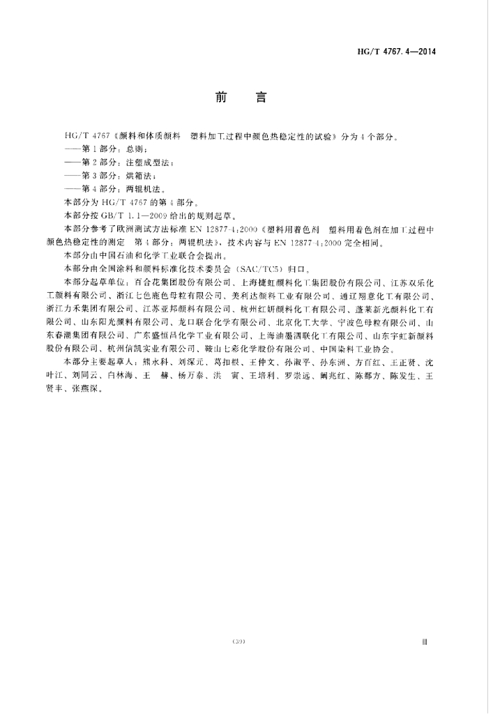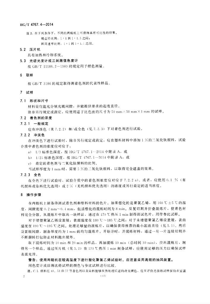 HG/T 4767.4-2014 颜料和体质颜料塑料加工过程中颜色热稳定性的试验 第4部分:两辊机法