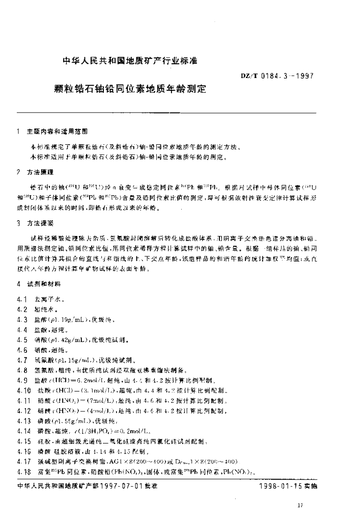 DZ/T 0184.3-1997 颗粒锆石铀铅同位素地质年龄测定