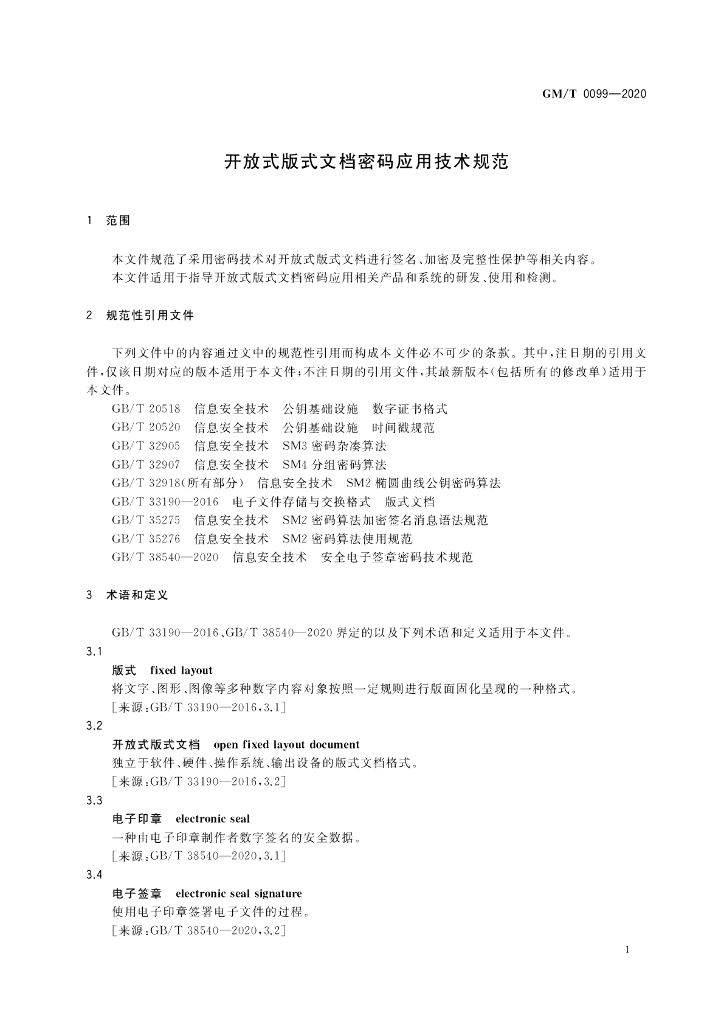 GM/T 0099-2020 开放式版式文档密码应用技术规范