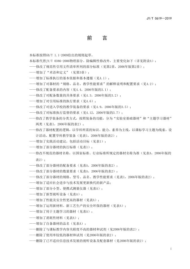 JY/T 0619-2019 初中物理教学装备配置标准