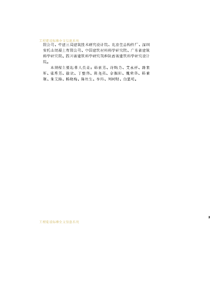 北京建工集团有限责任公司、北京城建集团有限责任公司混凝土公司、沈阳北方建设集团、上海徐汇区建工质量监督站、上海建工材料工程有限公司、山西四建集团有限公司、中建三局建筑技术研究设计院、北京住总构件广、深圳安托山混凝土有限公司、中国建筑材料科学研究院、广东省建筑科学研究院、四川省建筑科学研究院和陕西省建筑科学研究设计院