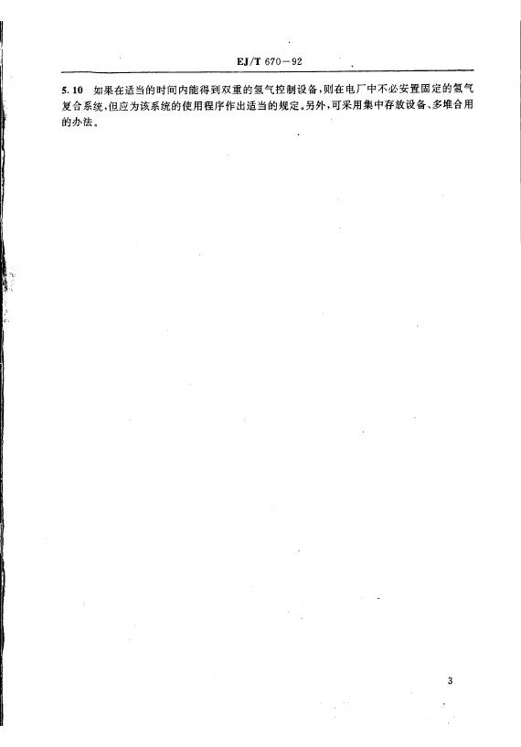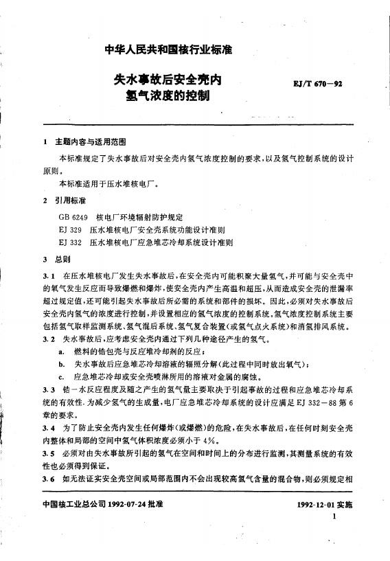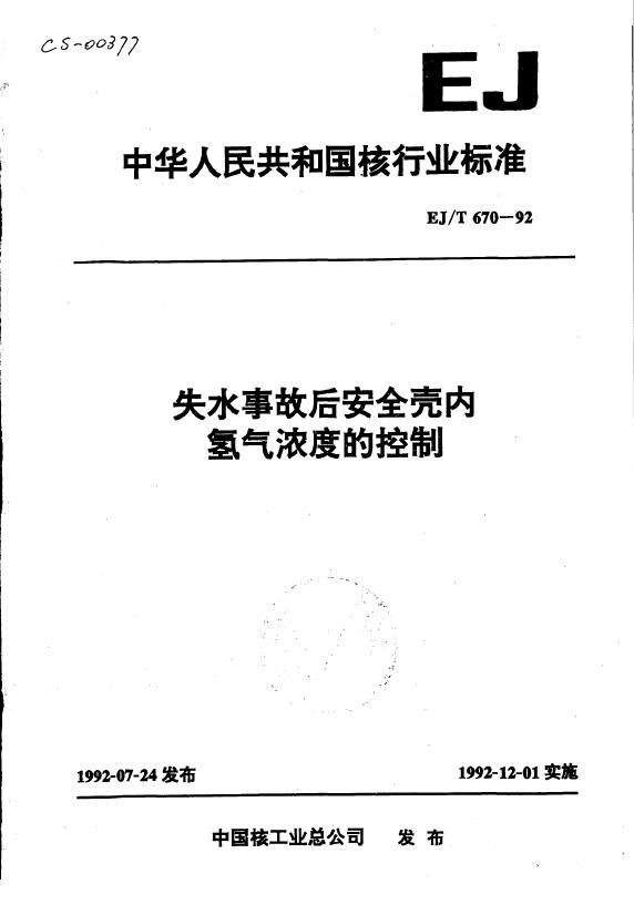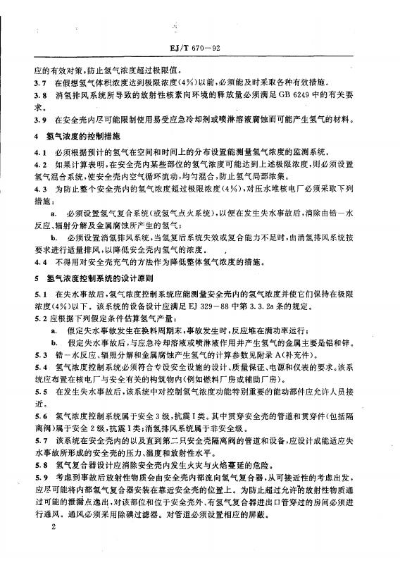 EJ/T 670-1992 失水事故后安全壳内氢气浓度的控制