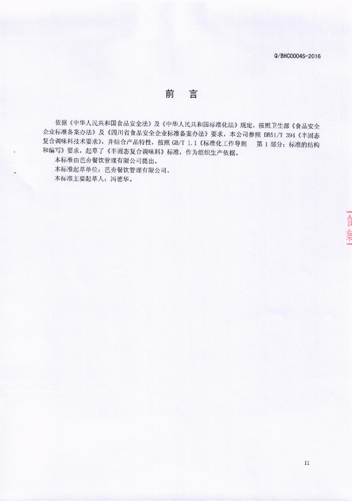 Q/BHC 0004S-2016 芭夯餐饮管理有限公司 半固态复合调味料