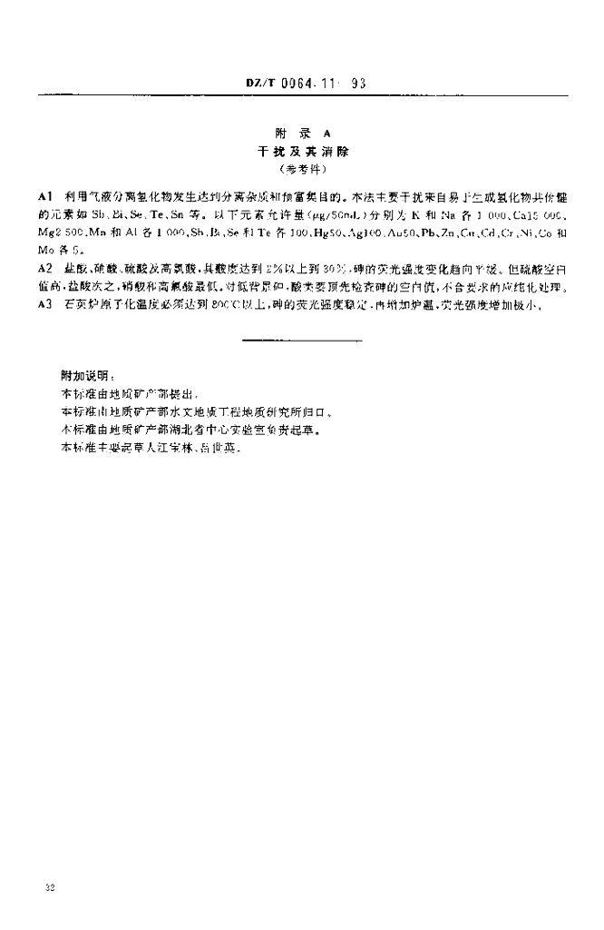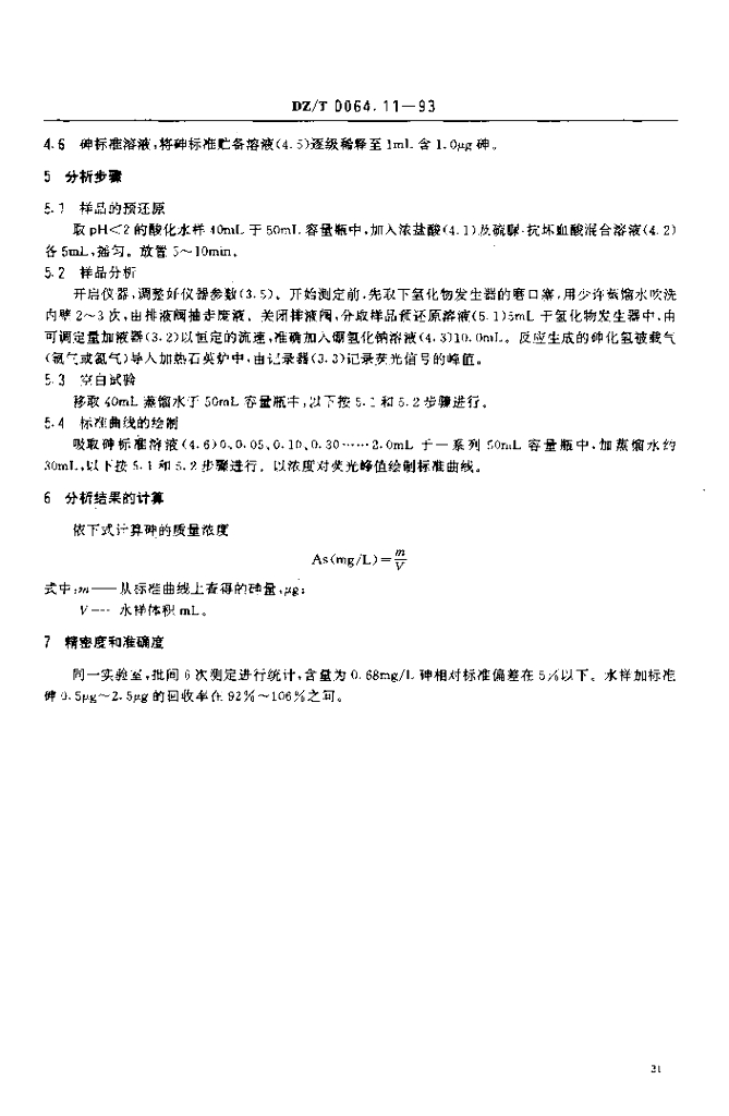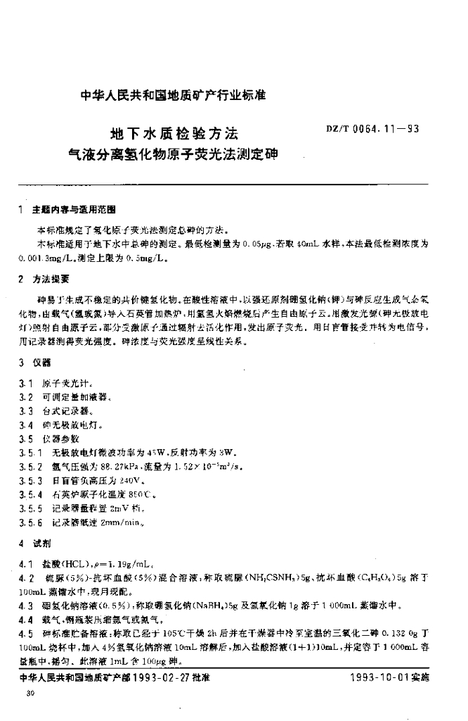 DZ/T 0064.11-1993 地下水质检验方法 气液分离氢化物原子荧光法测定砷