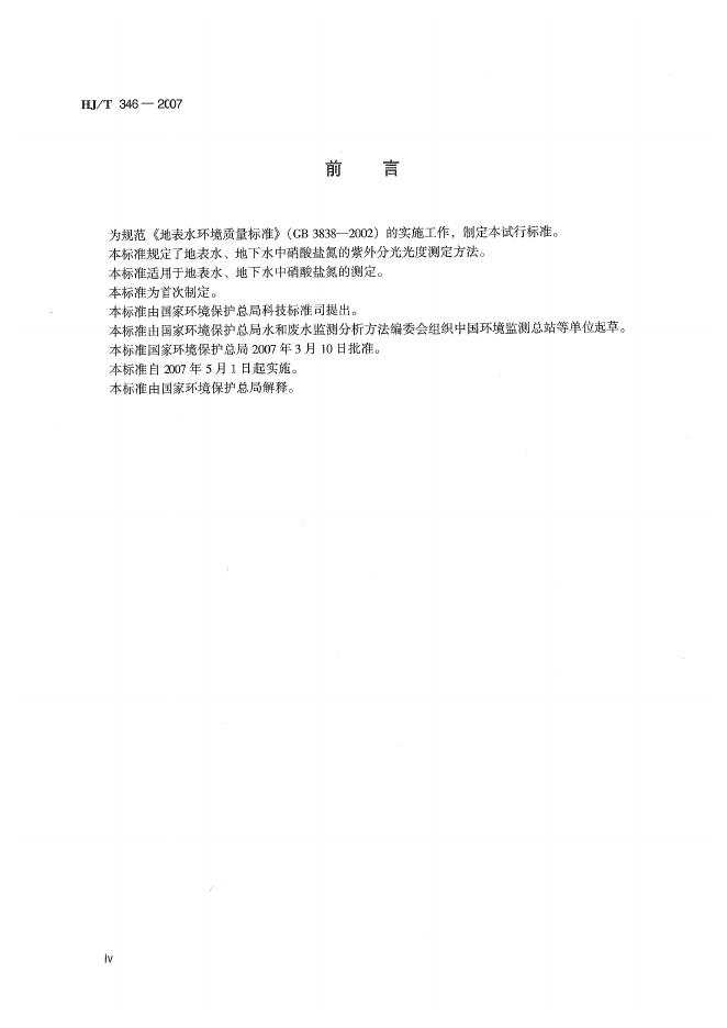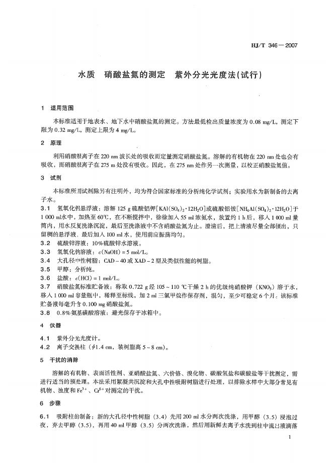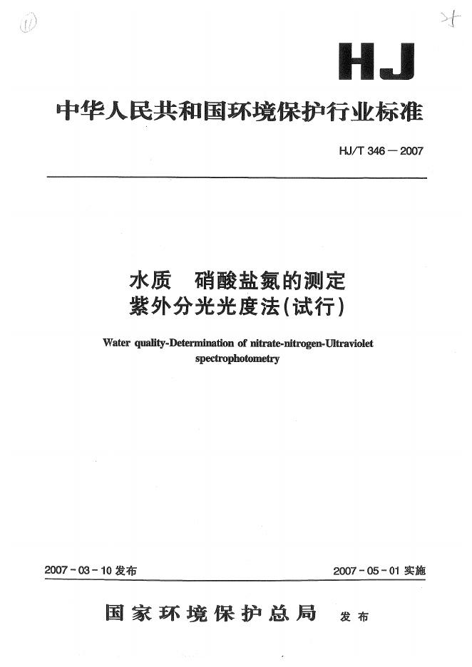 HJ/T 346-2007 水质 硝酸盐氮的测定 紫外分光光度法(试行)