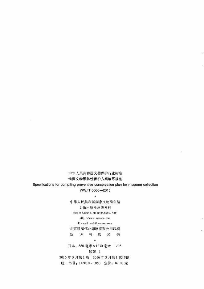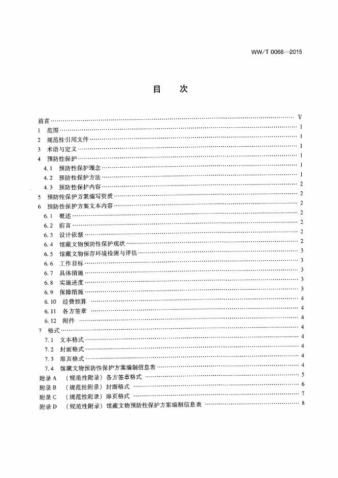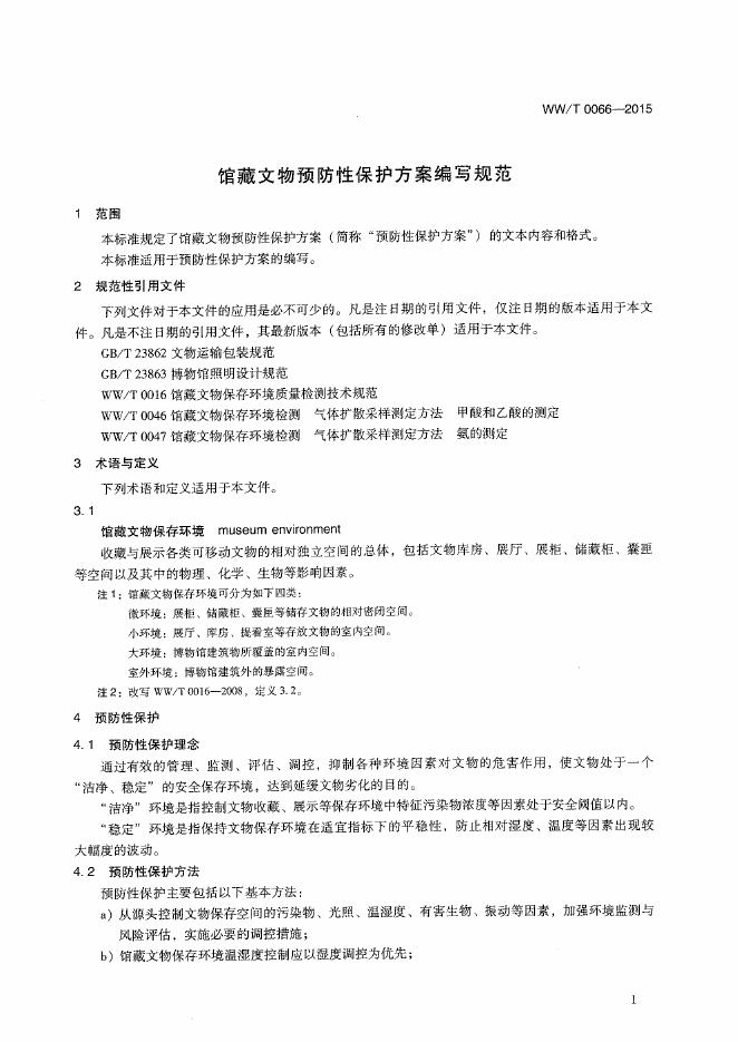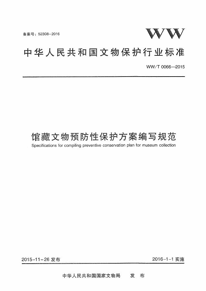 WW/T 0066-2015 馆藏文物预防性保护方案编写规范