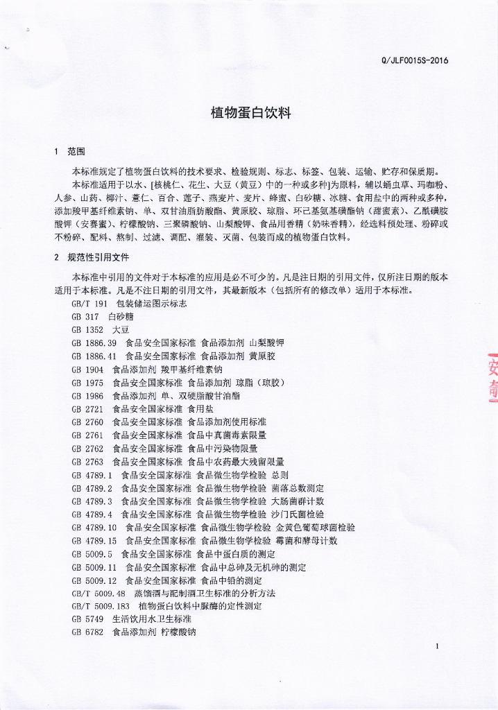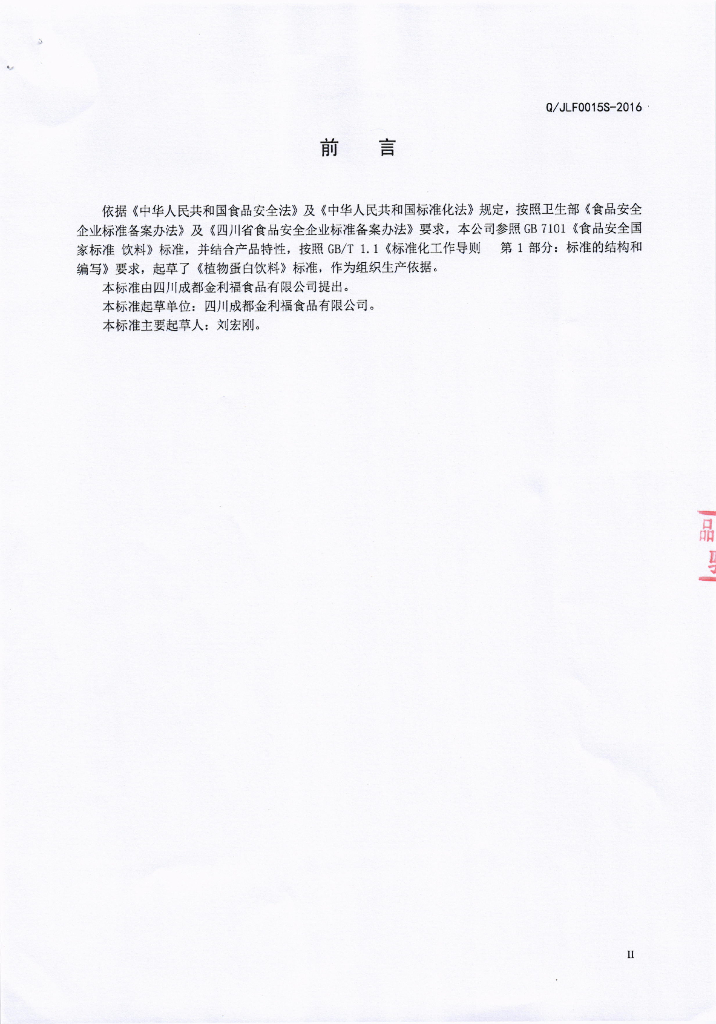 Q/JLF 0015S-2016 四川成都金利福食品有限公司 植物蛋白饮料