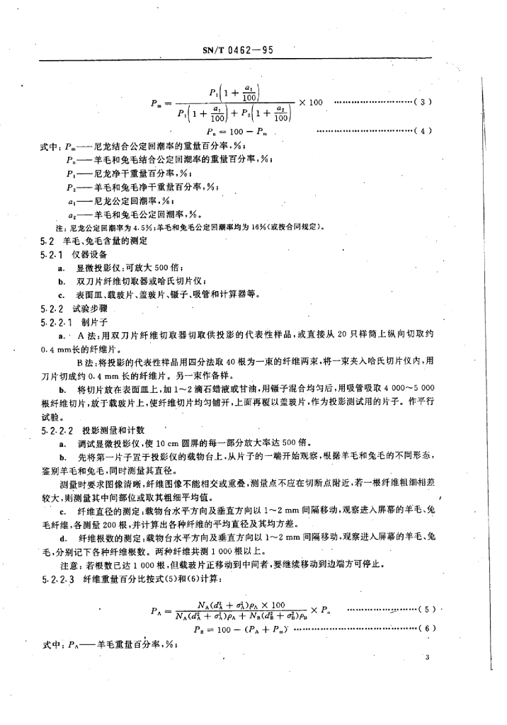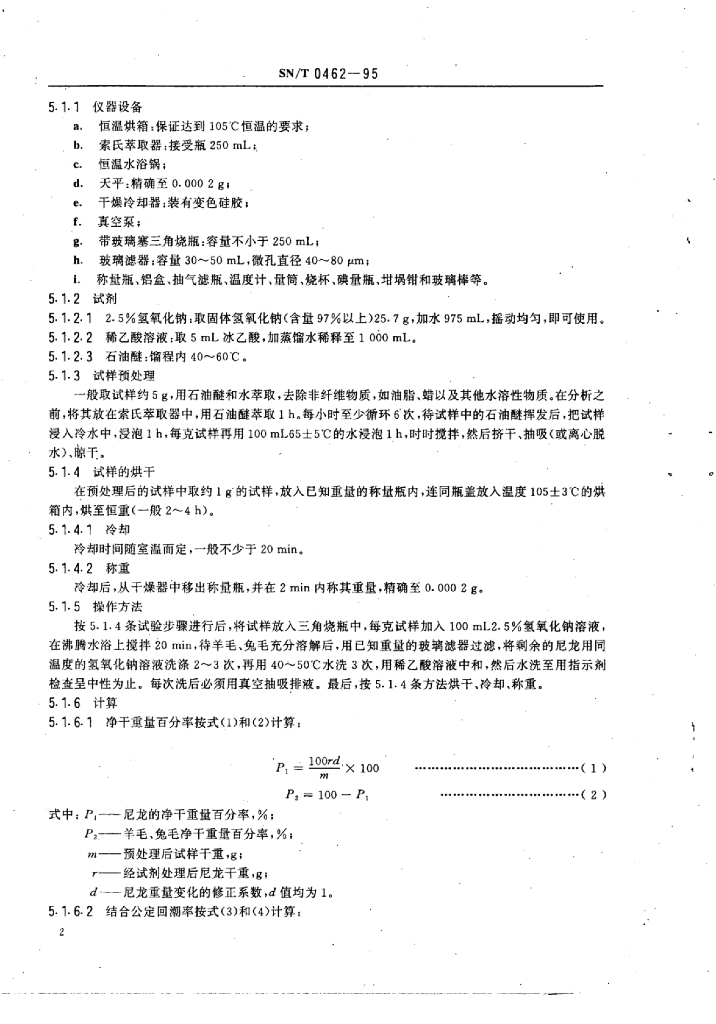SN/T 0462-1995 进出口尼龙、兔毛、羊毛混纺毛纱三组分含量测定方法