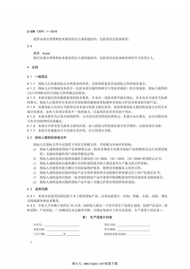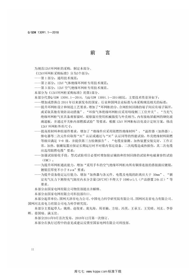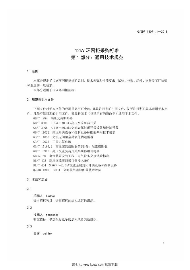Q/GDW 13091.1-2018 12kV环网柜采购标准 第1部分:通用技术规范