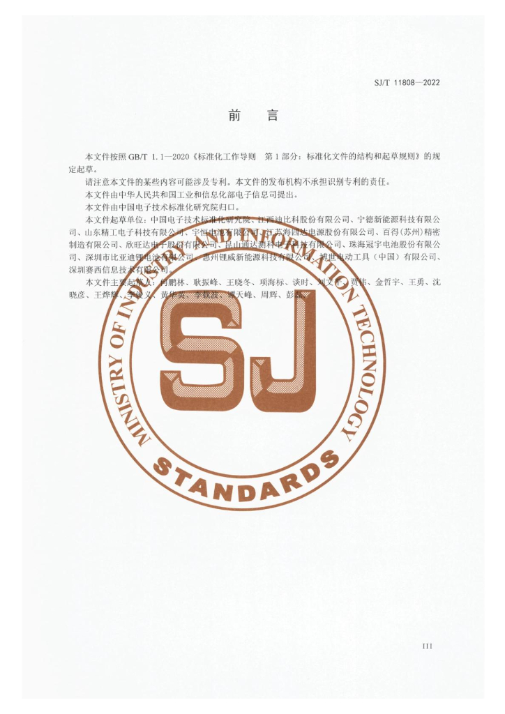 中国电子技术标准化研究院、江西迪比科股份有限公司、宁德新能源科技有限公司、山东精工电子科技有限公司、宇恒电池股份有限公司、百得(苏州)精密制造有限公司、欣旺达电子股份有限公司、昆山通达测科电子科技有限公司、珠海冠宇电池股份有限公司、深圳市比亚迪锂电池有限公司、惠州锂威新能源科技有限公司、博世电动工具(中国)有限公司、深圳赛西信息技术有限公司