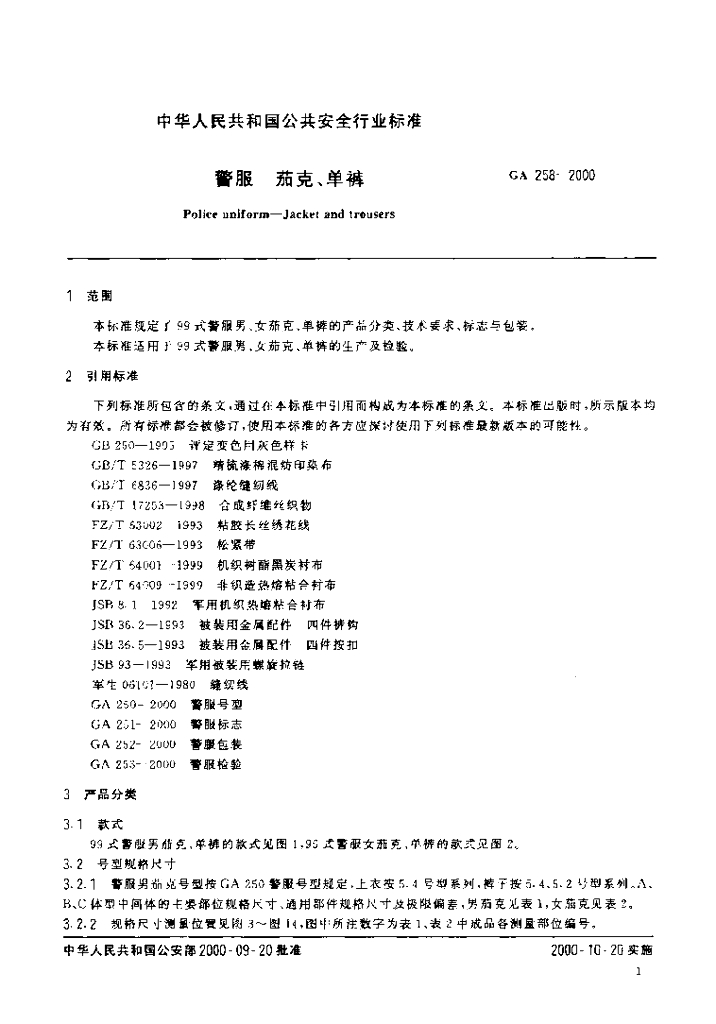 GA 258-2000 警服 茄克、单裤