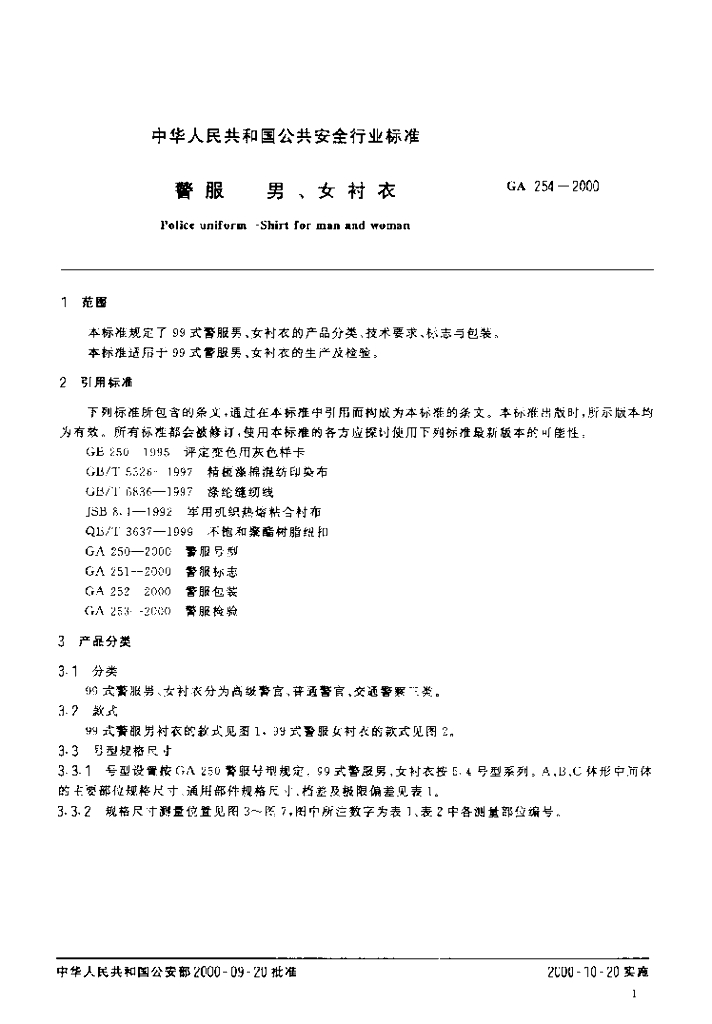 GA 254-2000 警服 男、女衬衣