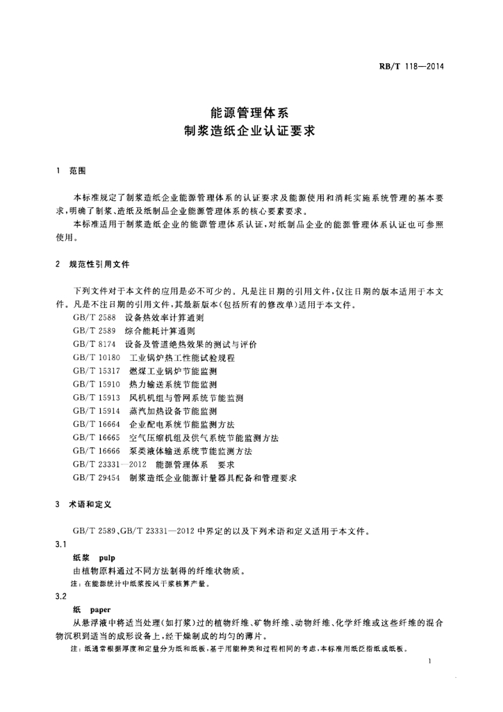 RB/T 118-2014 能源管理体系造纸企业认证要求