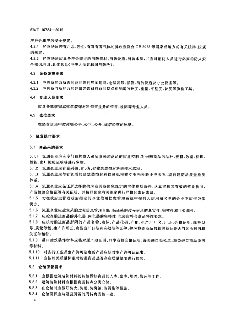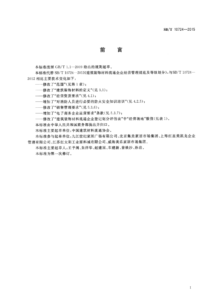 SB/T 10724-2015 建筑装饰材料流通企业经营管理规范及等级划分